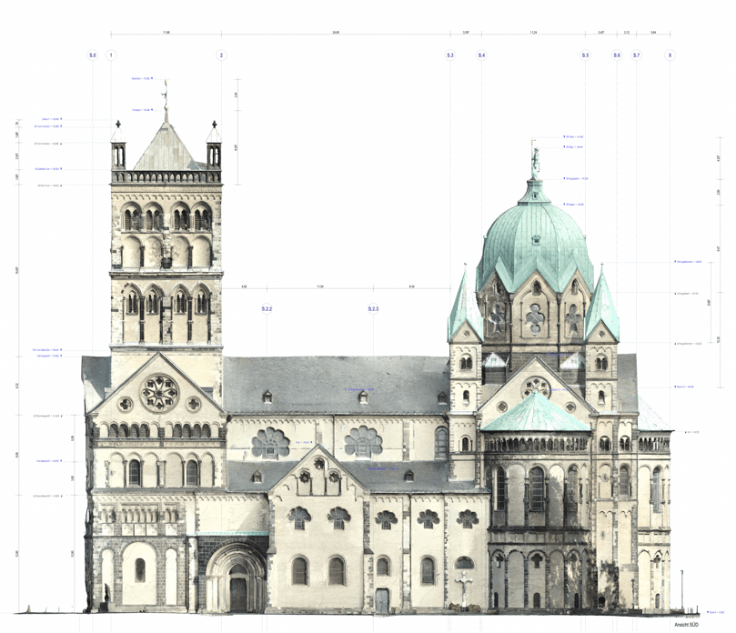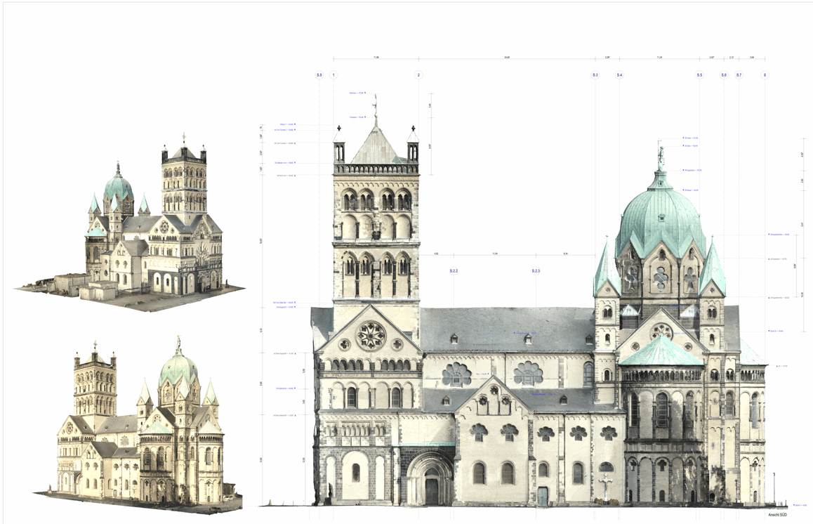Grundrisse, Schnitte und Ansichten werden verformungsgerecht aus der Punktwolke abgeleitet.